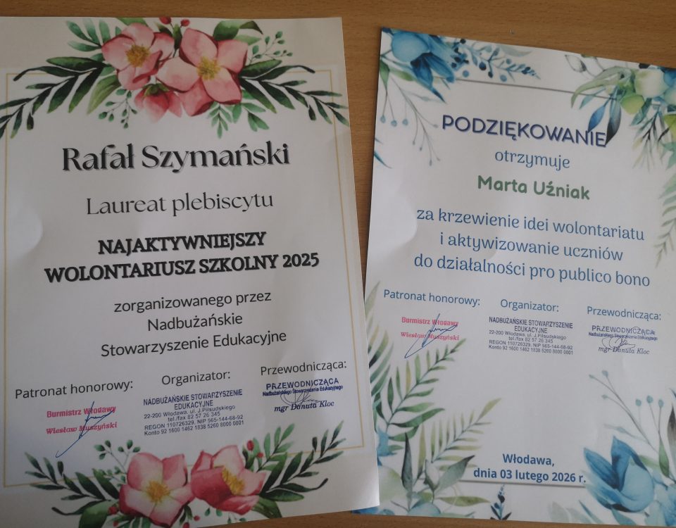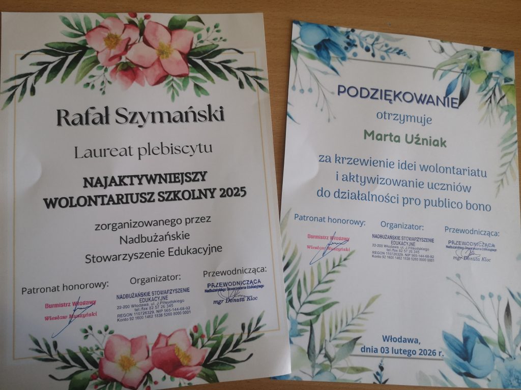 Dnia 3 lutego 2026 r. podczas sesji Rady Miejskiej we Włodawie samorządowcy uhonorowali laureatów plebiscytu „Najaktywniejszy wolontariusz szkolny 2025”, zorganizowanego przez Nadbużańskie Stowarzyszenie Edukacyjne pod honorowym […]